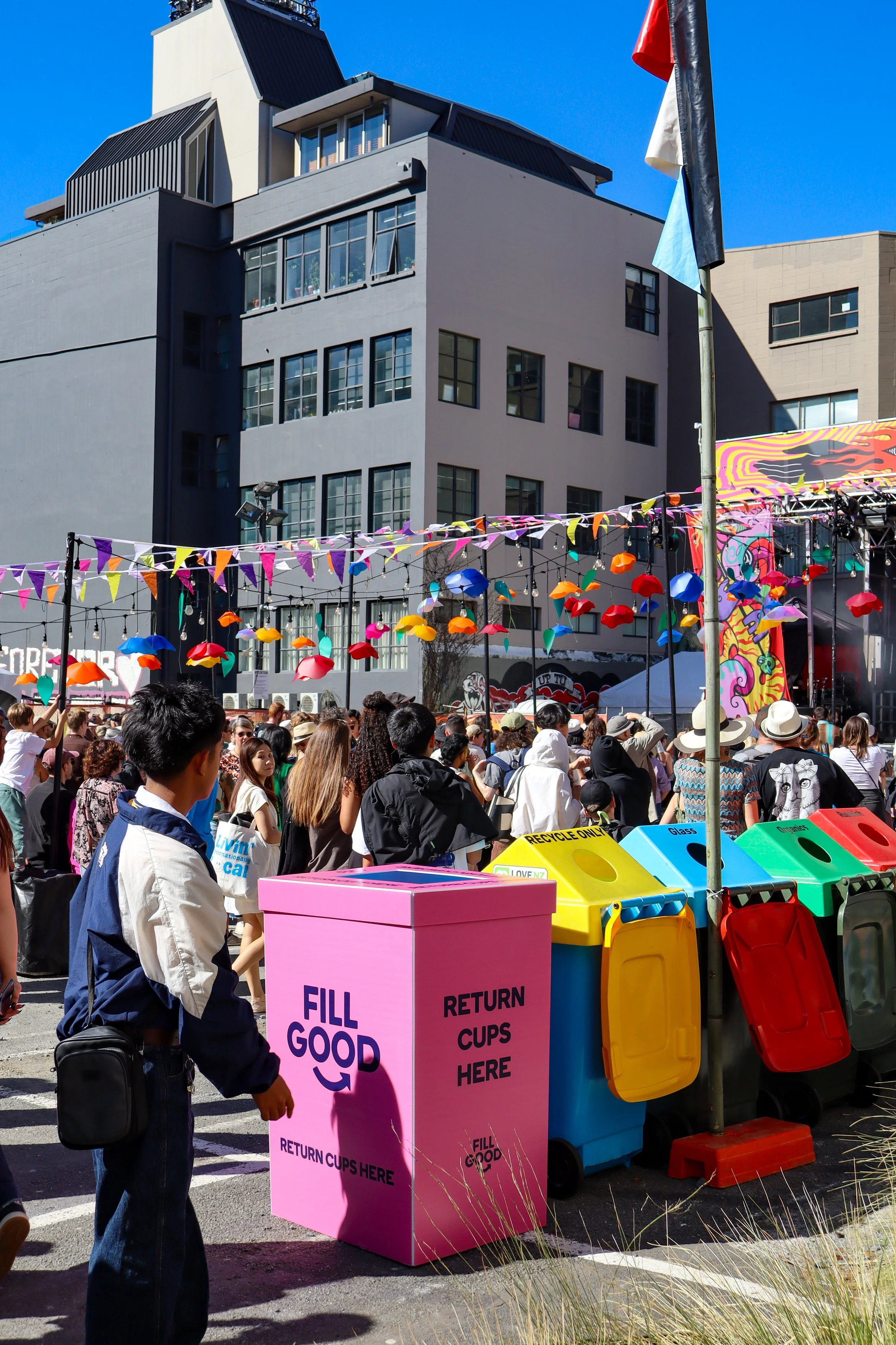 Custom return bins and signage guided the flow across the festival
